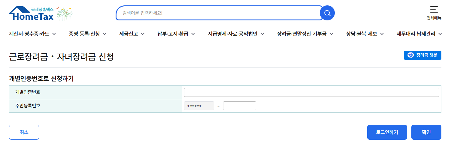 - [근로·자녀장려금 신청] → [신청하기] → 계좌 입력 후 제출